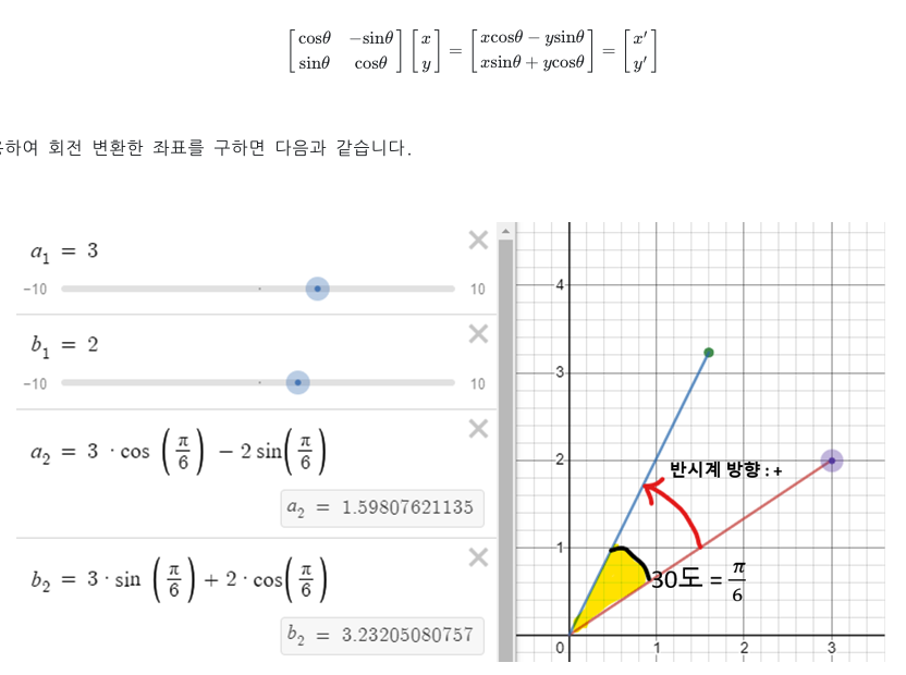 회전 변환과 매우 흡사하게 생겼다. 아래 그림은 김진솔 님의 블로그에서 퍼온 것인데, 2차원 벡터에서 세타만큼 회전할 때 사용하는 수식과 매우 흡사하다. 다만 다른점이라고는 learning 하는 파라미터가 중간에 들어갔다 정도이다.